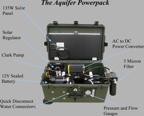 The New Aquifer Powerpack is configured for Military, Disaster Relief and Expeditionary use. The Powerpack model has a solar panel and a